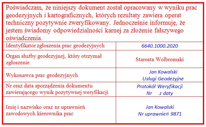 5. Treść oświadczenia, o którym mowa w ust. 2 pkt 3, zawiera dane identyfikujące zgłoszenie prac geodezyjnych, w tym nazwę organu Służby Geodezyjnej i Kartograficznej, który otrzymał zgłoszenie prac geodezyjnych, wykonawcę prac geodezyjnych, imię i nazwisko oraz numer uprawnień zawodowych kierownika prac geodezyjnych, a także numer oraz datę sporządzenia dokumentu potwierdzającego wynik pozytywnej weryfikacji.
