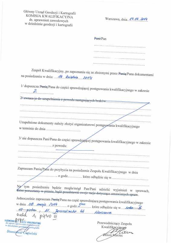 Pismo już miałem o uzupełnienie dokumentów, uzupełniłem i teraz dostałem takie pismo jak w załączeniu. Czyli rozumiem, że najpierw sprawdzili wszystkie dokumenty czy są jak brakowało to pisali a teraz dopiero komisja zapozna się z treścią tych dokumentów i doprecyzuje mi (o ile będzie wszystko oki w dokumentach) w jakiej sali jest egzamin, lub powiadomią mnie, że nie spełniam wymagań (czyli np. za mało wytyczeń wpisałem)