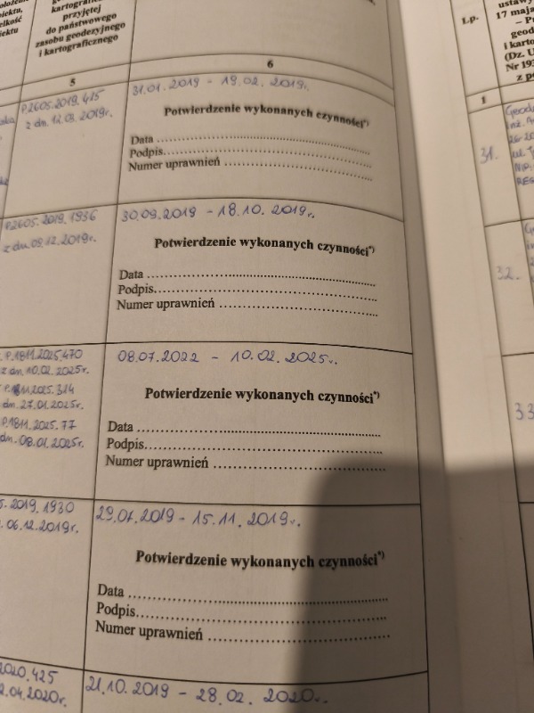 Czyli daty wykonanych prac też miałeś niechronologicznie? Jakie w tej sytuacji wpisałeś daty przy podpisie geodety? Czy też bez chronologii?  Czy może lepiej w tej sytuacji wpisać jedną datę wszędzie? Chociaż zastanawiam się czy to też w porządku. W załączniku przesyłam zdjęcie jak to u mnie wygląda w wykazie: jedna praca jest z roku 2019, za chwilę z 2025 , później znów z 2019. Nie wiem jak w tej sytuacji wpisać daty podpisu.