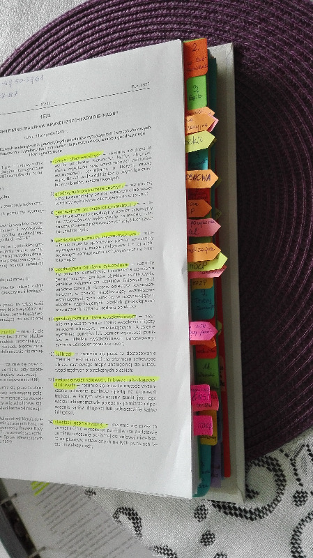 Przygotowuje się do egzaminu i akty prawne zebrane w segregatorach rozdzielam białymi zakładkami z nazwą aktu lub jego częścią, np KPA i na jednej z zakładek wypunktowane:
