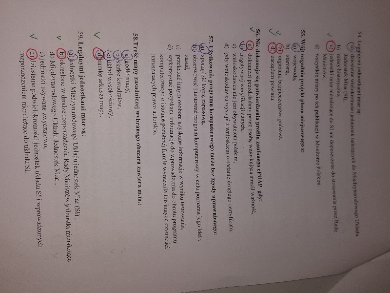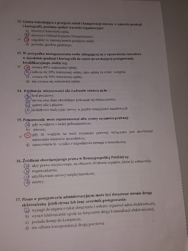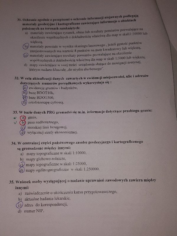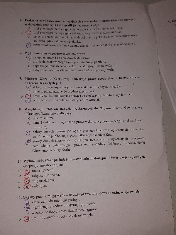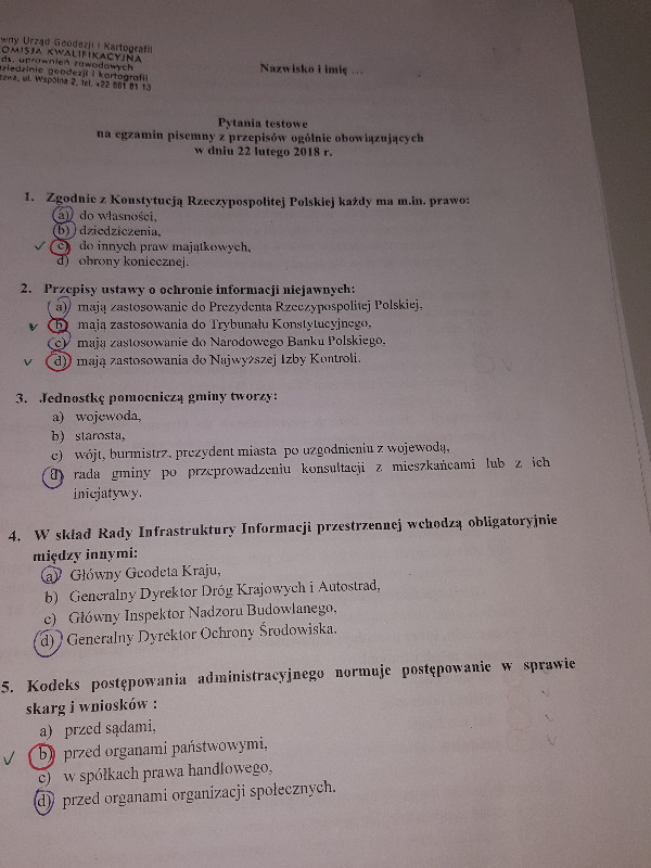 Po raz 1000 przeglądam testy z 2018r. i tak mnie naszło że chyba źle interpretujemy te zdjęcia co tu są. Trzeba zauważyć iż na czerwono są zaznaczone odpowiedzi przez osobę z komisji ale moim zdaniem jest pewna tendencja. Jeżeli w pytaniu są odpowiedzi ale zdający tylko jedną zaznaczył jako prawidłową wówczas egzaminator zaznaczył czerwonym kółkiem drugą prawidłową ale w momencie kiedy zdający zaznaczył cztery odpowiedzi a są tylko trzy poprawne wówczas egzaminator również w kółko brał odpowiedź bledną. I teraz pytanie do osób które były robić zdjęcia swoich egzaminów. Rozumiem że poza swoim egzaminem nie dostaliście nic innego mam tu namyśli osobną kartkę tylko z odpowiedziami. Przepisywaliście odpowiedzi według klucza ? ale z własnego egzaminu z tego co było na czerwono? jeżeli tak to powtarzam egzaminator zaznacza w kółko na czerwono poprawne odpowiedzi ale też błędne.